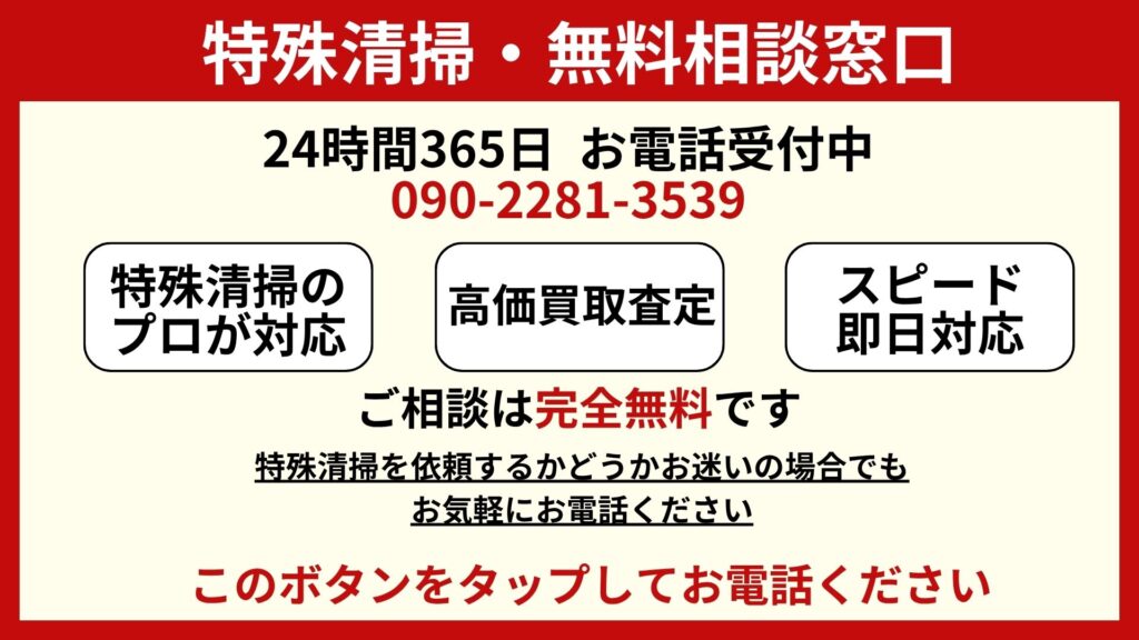 「どうしよう…」そんな緊急事態でお困りではありませんか?孤独死・自殺・事件現場・ゴミ屋敷・害虫発生…どんな困難な現場でも、岡山県内最短30分で駆けつけます。国家資格を持つ特殊清掃のプロが、最新機材と確かな技術で完全消臭を保証。見積もり無料・24時間365日対応で、お客様の緊急事態を即座に解決いたします。