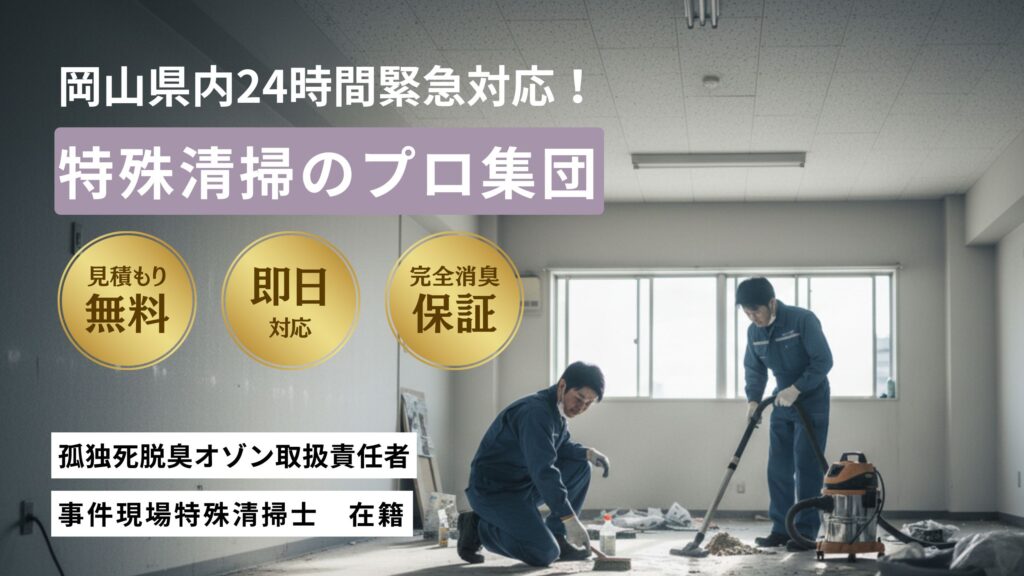 「どうしよう…」そんな緊急事態でお困りではありませんか?孤独死・自殺・事件現場・ゴミ屋敷・害虫発生…どんな困難な現場でも、岡山県内最短30分で駆けつけます。国家資格を持つ特殊清掃のプロが、最新機材と確かな技術で完全消臭を保証。見積もり無料・24時間365日対応で、お客様の緊急事態を即座に解決いたします。